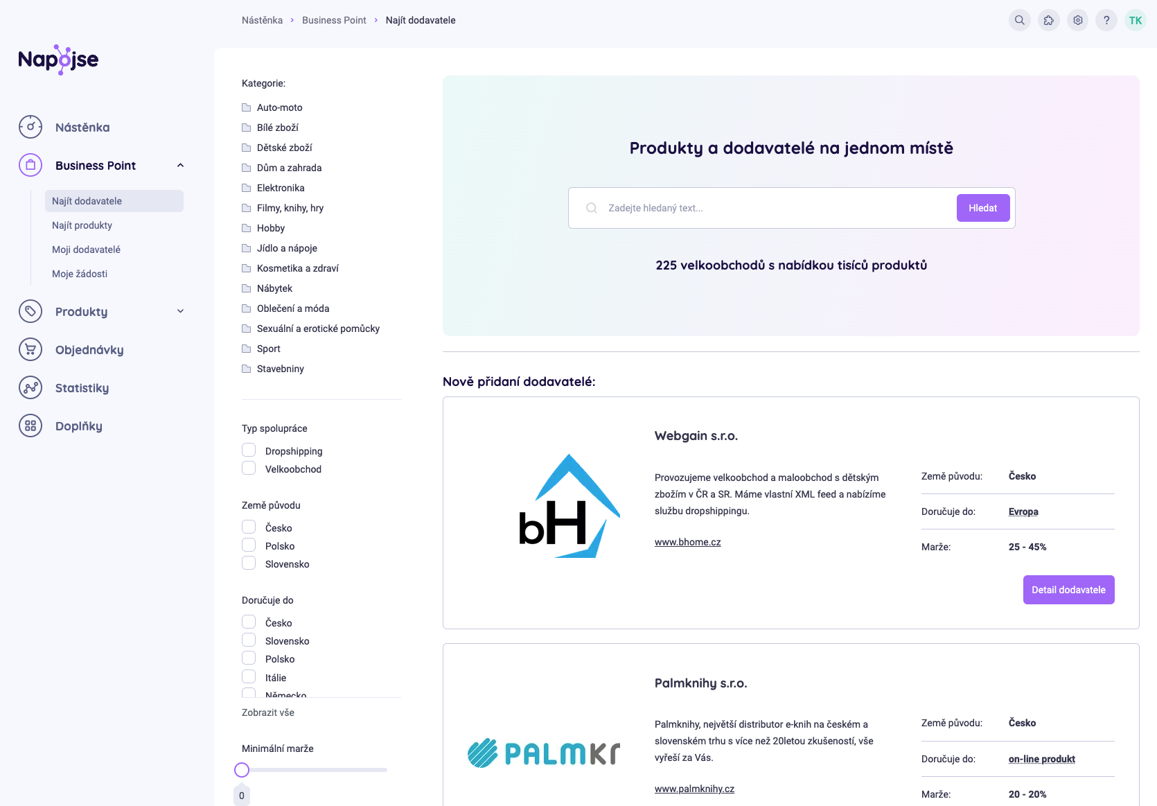 Právě tady hledá 3 000+ e-shoperů nové dodavatele. Nahrajte své produkty a medailonek firmy, noví odběratelé si vás brzy najdou.