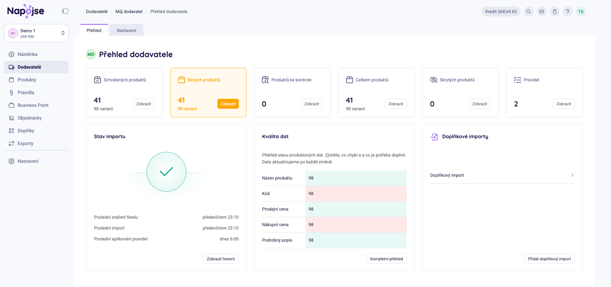 - Kompletní ekosystém - Na rozdíl od konkurence, která se zaměřuje pouze na jednotlivé aspekty, Napojse spojuje správu dodavatelů, dropshipping i napojení na zbožové srovnávače v jednom nástroji